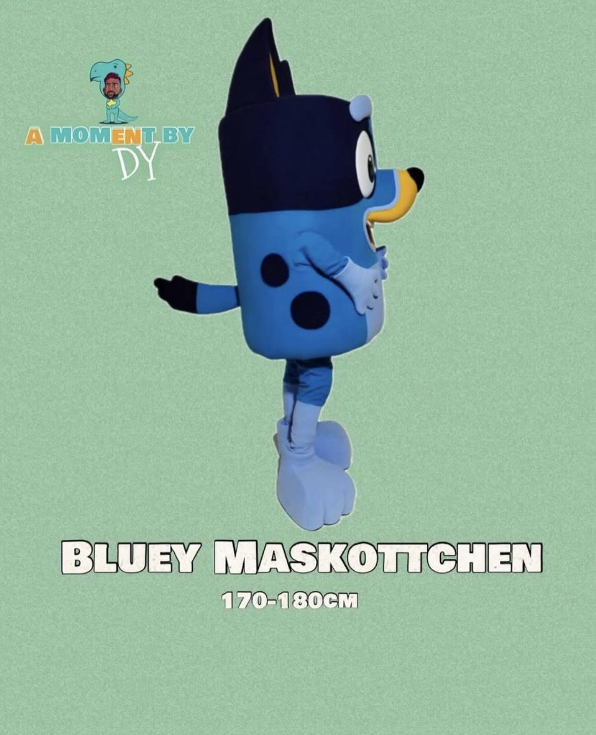 Die beliebte blaue Heeler-Hündin Bluey begeistert als lebensgroßes Maskottchen kleine und große Fans gleichermaßen. Mit ihrem freundlichen Gesicht und den charakteristischen blauen Farben sorgt Bluey für magische Momente und jede Menge Spielspaß auf Ihrer Feier.